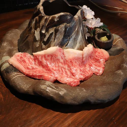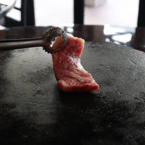 桜島の溶岩石で焼き上げる特撰黒牛は、1頭買いで仕入れた贅沢な肉質を堪能でき、旨みが引き立った香ばしい風味が広がります。